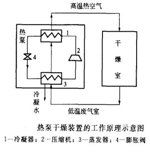 ①開路式 幹燥介質離(lí)開幹燥室進入熱泵的(de)蒸發器與熱泵工質換熱後直接排空,如(rú)圖21—6所示。