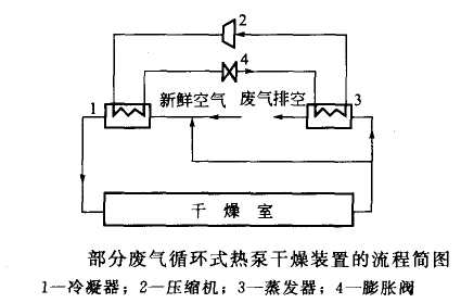 ③部分廢氣循環式 幹燥器排出廢氣的(de)一(yī)部分進人熱泵蒸發器後排空,另部分與新鮮生氣一(yī)起進人熱泵冷凝器被加熱後進入幹燥器內(nèi)循環使用,如(rú)圖