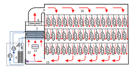 1、2 壓縮機; 3 冷凝器; 4、5 節流閥;6蒸發器;8 風機;9送風口;10 烤房;11 出風口;12 空氣處理(lǐ)室;13 新風口