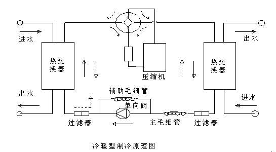 熱泵循環:通過四通換向閥,使制冷劑流向相反。經壓縮機壓縮的(de)高(gāo)溫高(gāo)壓制冷劑蒸汽經四通閥直接排入套管換熱器中向冷媒水放出熱量,從而産生制熱效果,被冷凝後的(de)制冷劑液體流經膨脹閥節流降壓,在風冷式換熱器中吸收環境的(de)熱量而蒸發,再吸入壓縮機壓縮構成熱泵循環。
