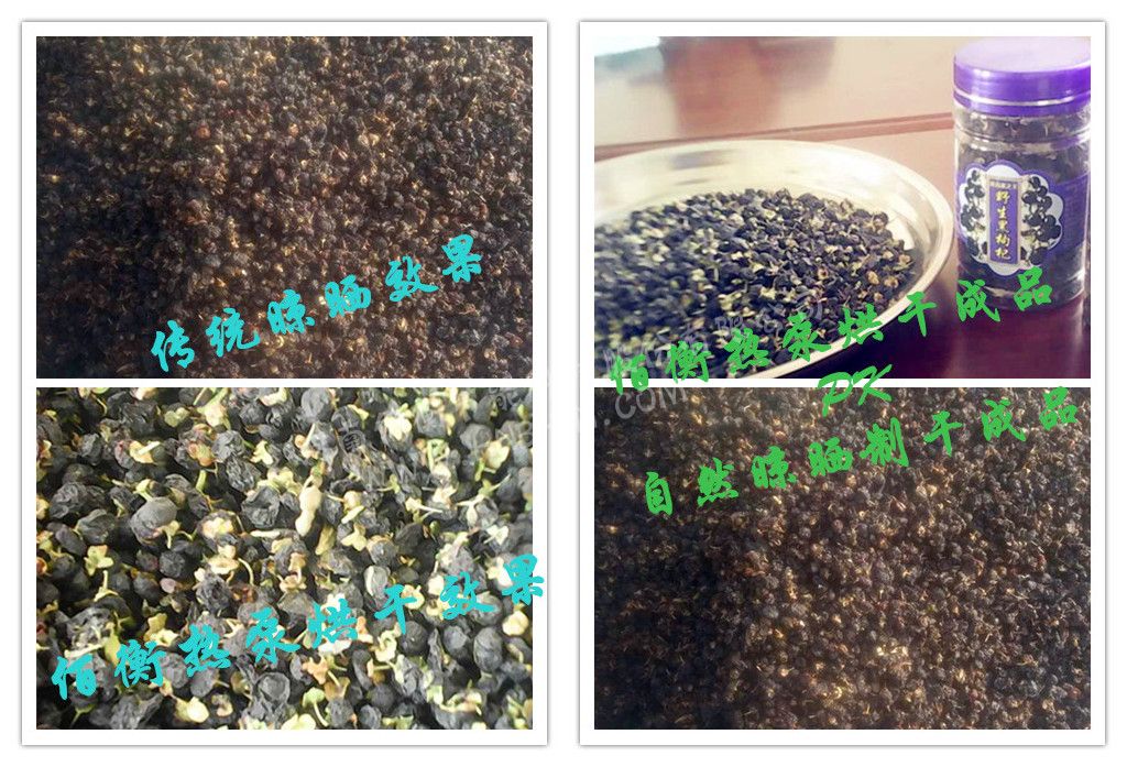 傳統自(zì)然晾曬制幹的(de)黑枸杞花瓣葉泛黃,佰衡公司熱泵烘幹設備烘幹的(de)黑枸杞*明顯特點是:黑果綠瓣保有原來的(de)品相,品*高(gāo)、色澤誘人,并且吃起來口感要比晾曬的(de)甘甜,花青素含量更高(gāo)。